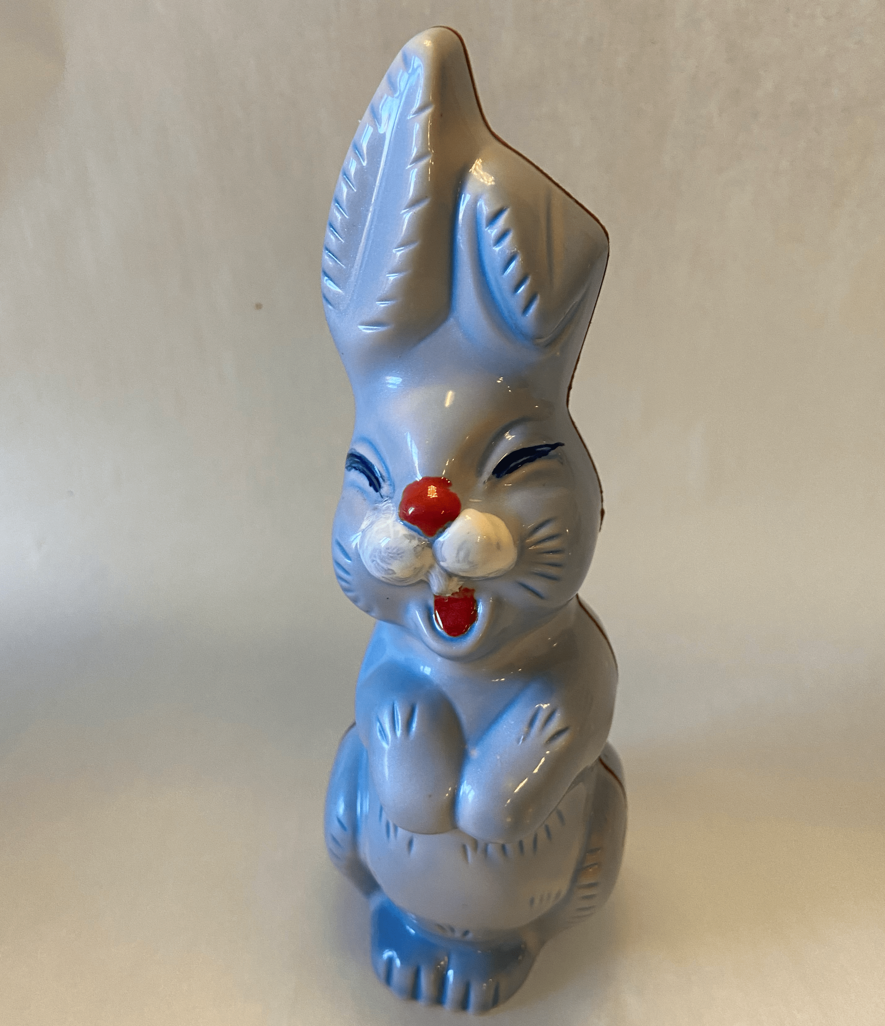 125 gram semi-solid chocolate bunny, available in 4 different kinds of fair trade, sustainable chocolate and assorted colours.